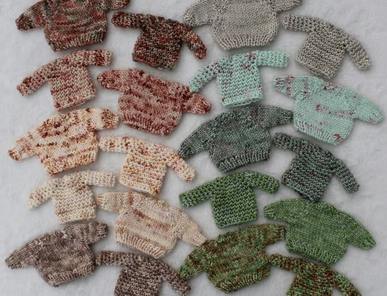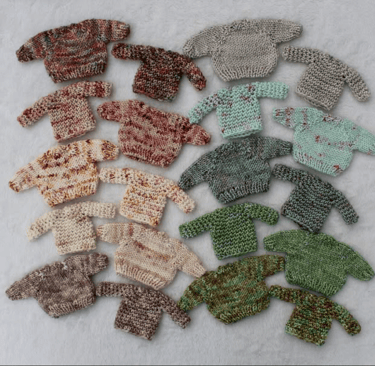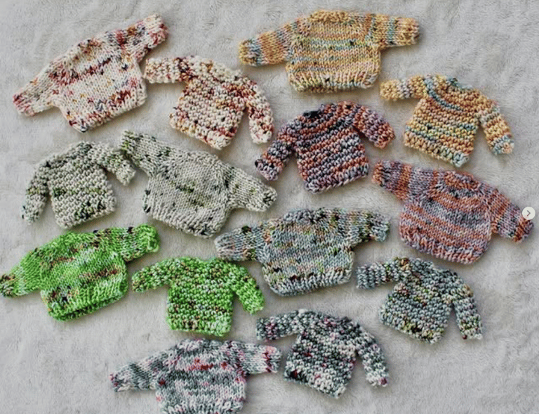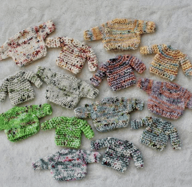 "I’m so grateful to the girls who have made these tiny sweaters happen for both of my newest collections. They are the cutest ever and I love having them to show off as swatches because you can see what the colors look like in the round!! Thank you to @sarahs.handmakes and @madisondaycrochet 🫶🏻" - Abby, owner of Poppy & Spruce Fibers