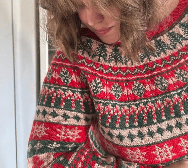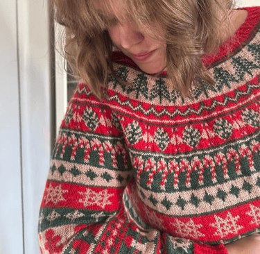 "A SHOWSTOPPER. Sarah was so patient with me throughout the entire process of this sweater- I think she frogged back at least 3 times because I changed my mind about charts? The result is the gaudy Christmas sweater of my dreams and I'm so grateful for Sarah's stunning Colorwork. Best most dedicated sample knitter I know 🥹💕"- Lauren, owner of Little Fiber Co