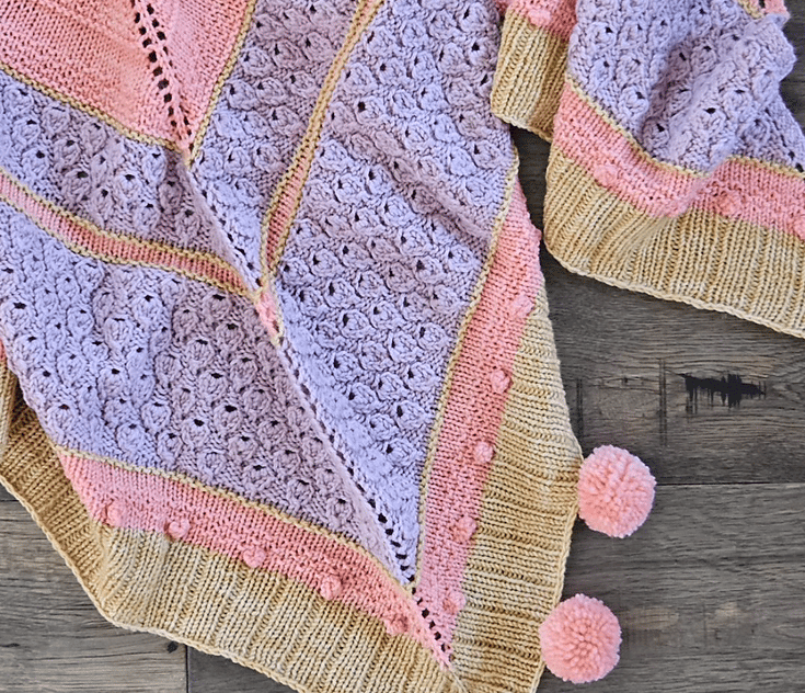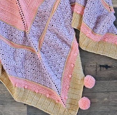 Yarns: Salty Blonde Fine Fibers Praire Base in Apricot Chiffon (pink), Mirabelle (yellow), and Raspberry Sorbet (purple)